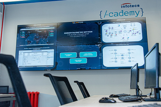 Лаборатория с киберполигоном Ampire и функционалом квантового распределения ключей на базе продуктов и решений для защиты информации от группы компаний «ИнфоТеКС».На занятиях студенты тренируют навыки обнаружения компьютерных атак на сетевую инфраструктуру предприятия, а также методы противодействия им.